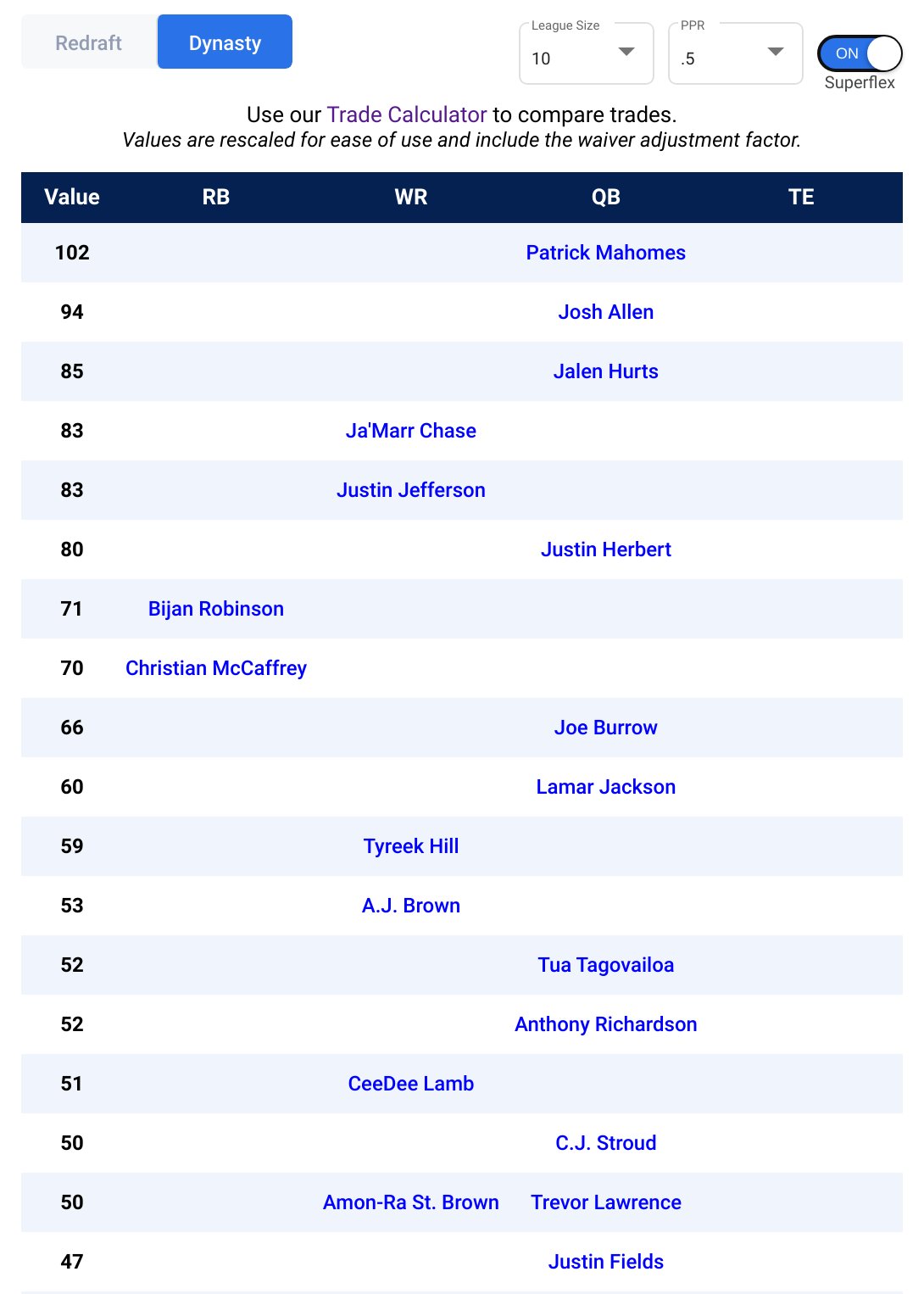 Web Build fantasy dynasty or redraft trades with our trade calculator using KeepTradeCut FantasyCalc DynastyProcess and more. Web Entering its 13th season the Fantasy Football Trade Chart has been an original staple on CBS Sports to help you make trades in your non-PPR PPR and. Web Algorithmically generated dynasty fantasy football rankings trade values and tools created from hundreds of thousands real trades.